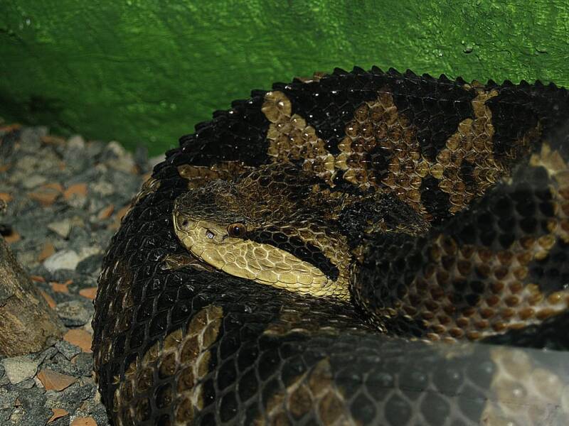 Es carnívora: se alimenta de pequeños mamíferos, aves, ranas y lagartijas. Caza al acecho, utilizando su camuflaje para emboscar a sus presas, a las que inmoviliza con su potente veneno hemotóxico.